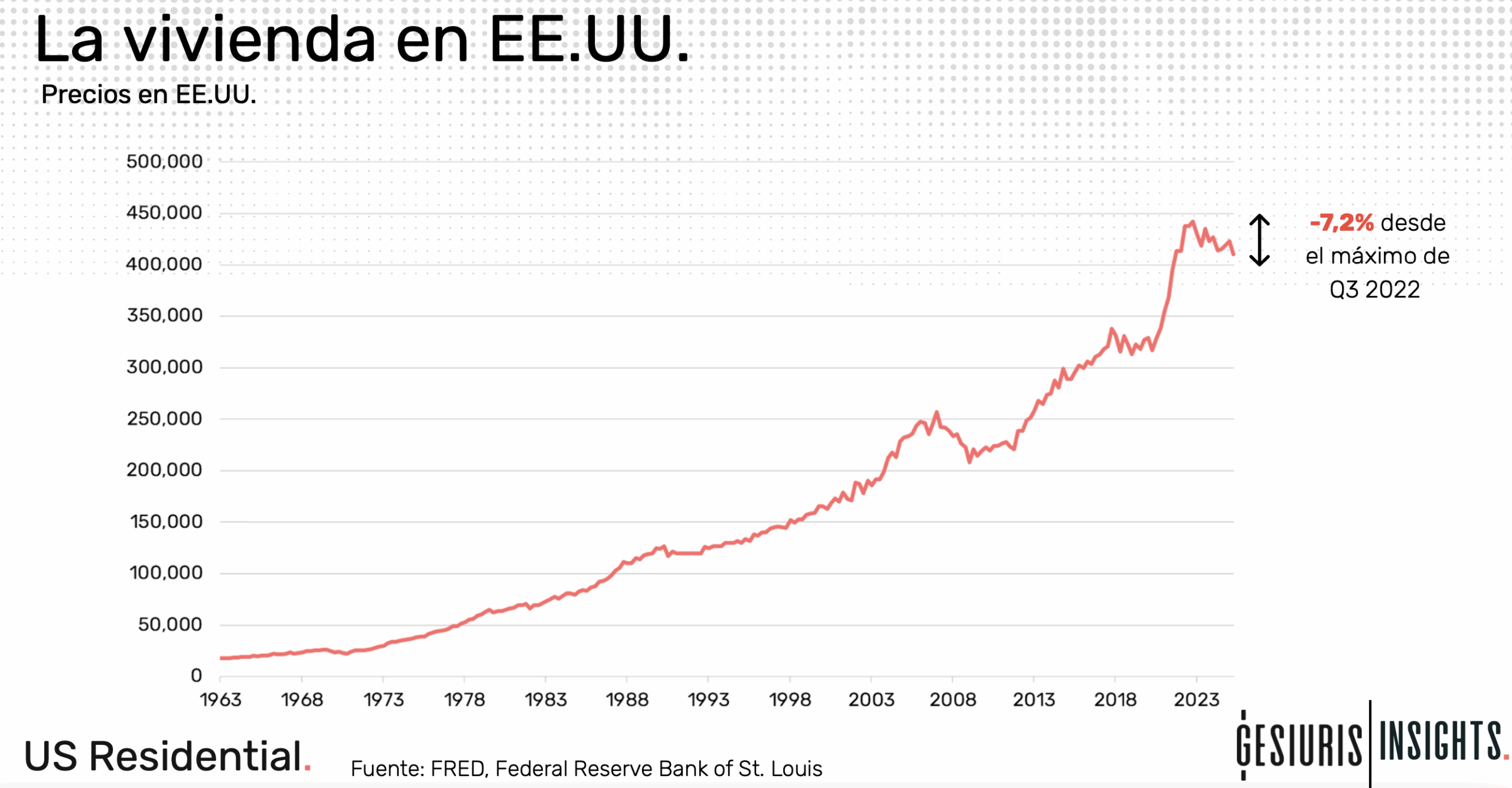 Precio de la vivienda en USA. Alzas continuadas a partir de 1971. informe sobre el sector de REITs inmobiliarios en Norteamérica (Gesiuris Insights).