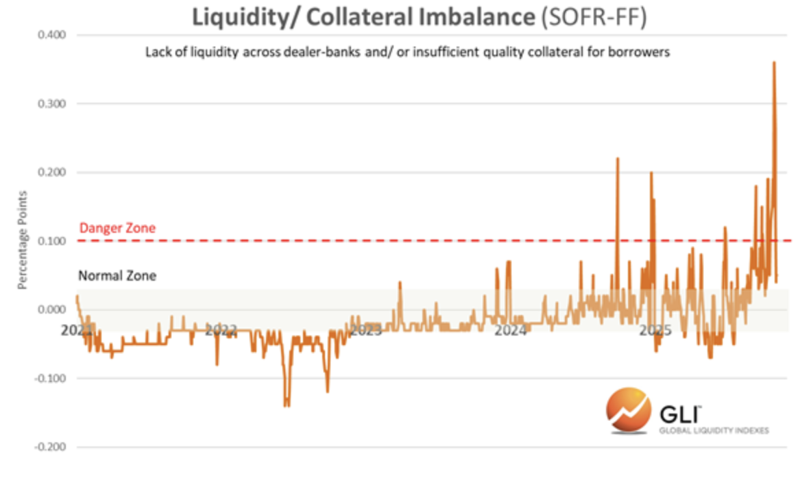El estrés alcanzó su punto máximo a finales de octubre de 2025 y se redujo parcialmente el 9 de noviembre tras la intervención de la FED, que permitió un alivio del spread en el mercado de repos.